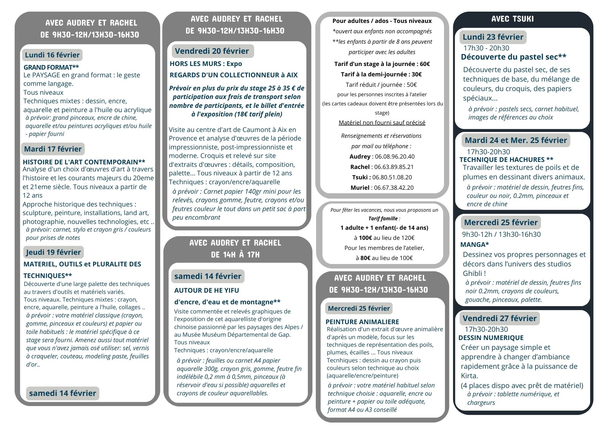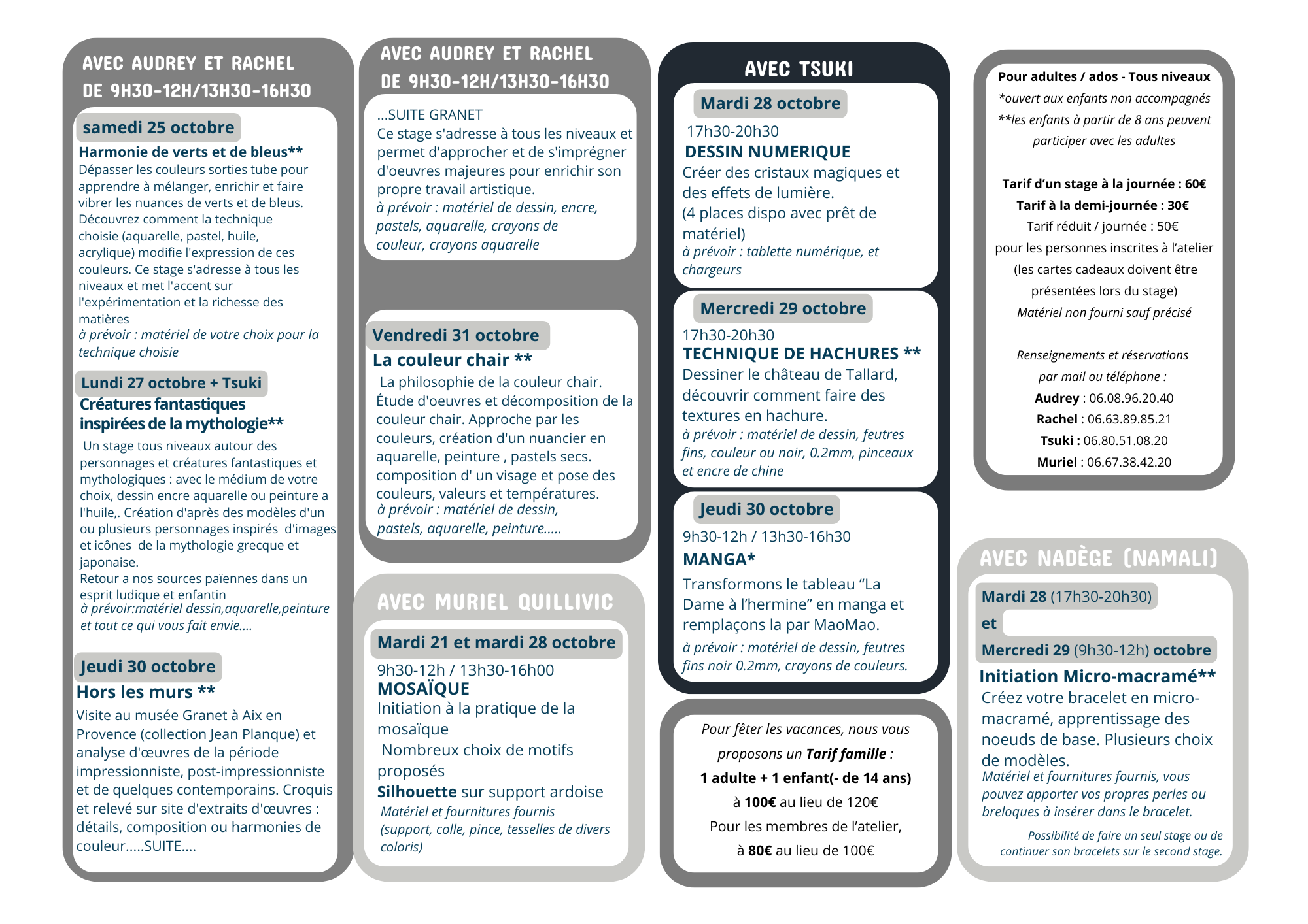 Des stages prennent place durant les vacances scolaires, à l’exception des vacances de Noël. Les programmes seront mis à disposition sur cette pages 2 à 3 semaines avant les vacances.